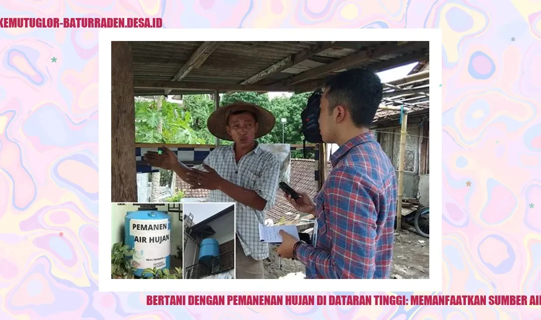 Dalam bertani dengan pemanenan hujan di dataran tinggi, memanfaatkan sumber air alami seperti air hujan dapat menjadi solusi yang efektif untuk mengatasi keterbatasan air irigasi. Dengan menggunakan metode pemanenan hujan yang tepat, petani dapat mengumpulkan dan menyimpan air hujan, sehingga dapat digunakan saat musim kering tiba. Pemanenan hujan memiliki banyak manfaat dalam pertanian, termasuk mengurangi ketergantungan pada air irigasi, memperbaiki kualitas tanah, meningkatkan produktivitas pertanian, mengurangi biaya operasional, dan meningkatkan kemandirian petani. Namun, tidak semua petani perlu melakukan pemanenan hujan, karena keputusan tersebut harus didasarkan pada faktor-faktor yang relevan. Dengan memanfaatkan sumber air alami melalui pemanenan hujan, para petani dapat mengoptimalkan penggunaan air dan meningkatkan hasil panen mereka.