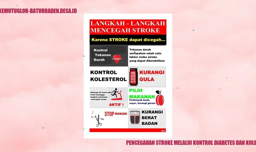 Pencegahan stroke melibatkan pengendalian faktor risiko seperti diabetes dan kolesterol. Diabetes dapat meningkatkan risiko stroke melalui tingginya kadar gula darah dan pembekuan darah yang abnormal, sedangkan kolesterol tinggi dapat menyebabkan penyumbatan arteri. Dengan mengontrol diabetes melalui pola makan yang sehat, olahraga, dan pengobatan, serta mengontrol kolesterol melalui pola makan rendah kolesterol dan olahraga, Anda dapat mengurangi risiko stroke secara signifikan. Selalu konsultasikan dengan dokter untuk pengobatan yang tepat dan jadwalkan pemeriksaan rutin untuk memantau kondisi kesehatan Anda.