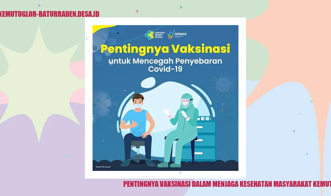 Pentingnya vaksinasi dalam menjaga kesehatan masyarakat Kemutug Lor sangatlah besar. Vaksinasi tidak hanya melindungi diri sendiri, tetapi juga melindungi orang-orang di sekitar kita dan membantu mencapai kekebalan komunitas. Vaksinasi telah terbukti efektif dalam mencegah penyebaran penyakit dan mengurangi beban penyakit pada masyarakat. Oleh karena itu, mari ikut serta dalam program vaksinasi yang disediakan oleh pemerintah dan menyebarkan kesadaran akan pentingnya vaksinasi kepada masyarakat Kemutug Lor.
