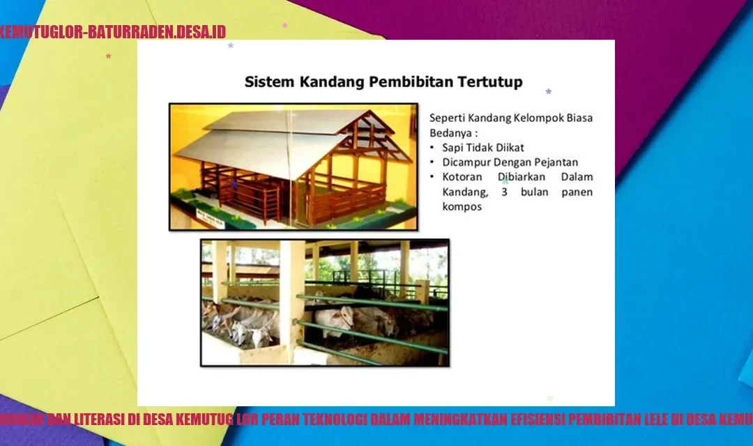 Penggunaan teknologi telah memberikan peran yang sangat penting dalam meningkatkan efisiensi pembibitan lele di Desa Kemutug Lor. Desa ini berada di Kecamatan Baturraden, Kabupaten Banyumas, Provinsi Jawa Tengah. Teknologi telah membawa dampak signifikan dalam meningkatkan produksi, mengoptimalkan penggunaan sumber daya, dan mengurangi biaya dalam budidaya lele.